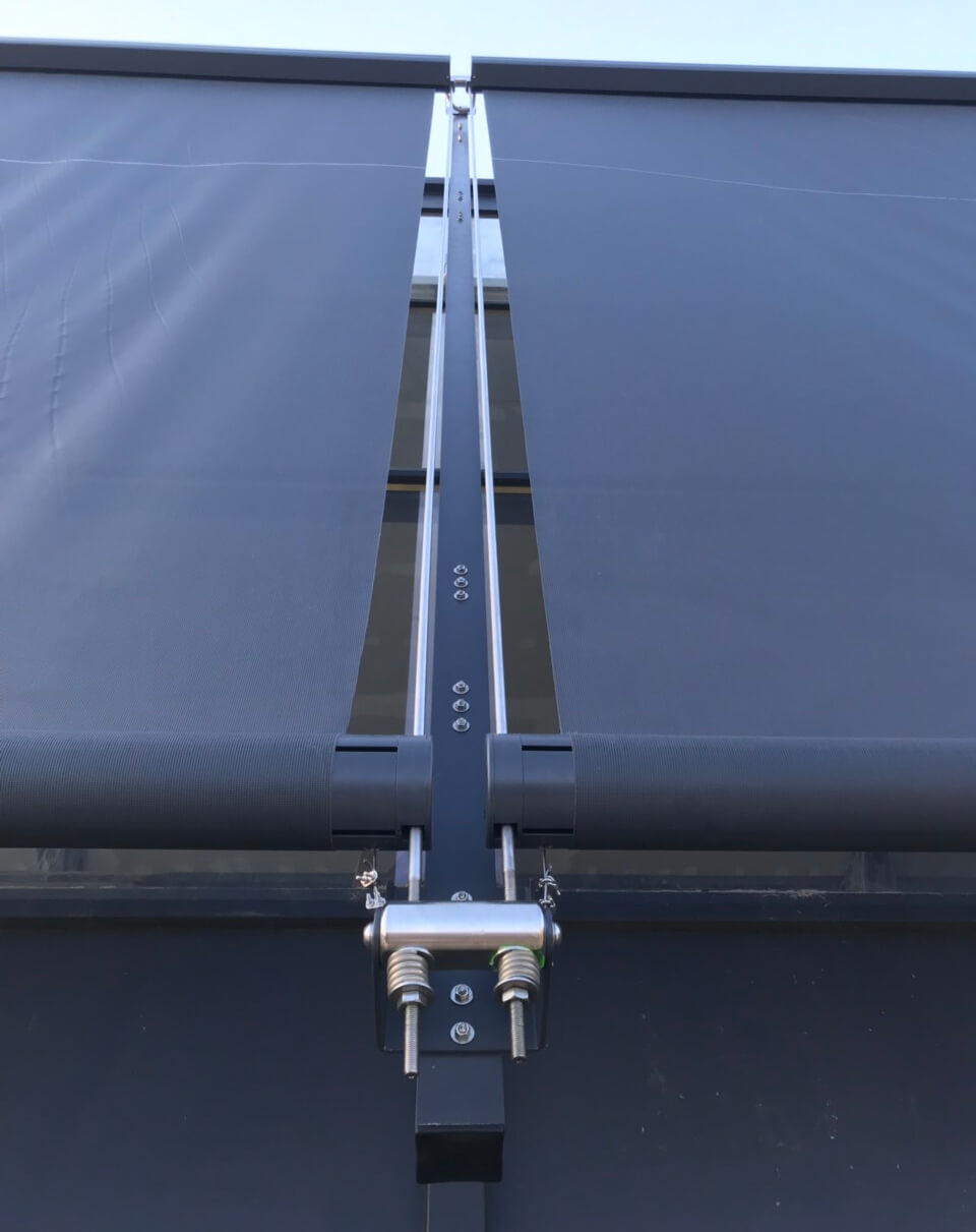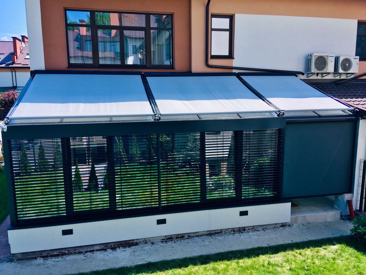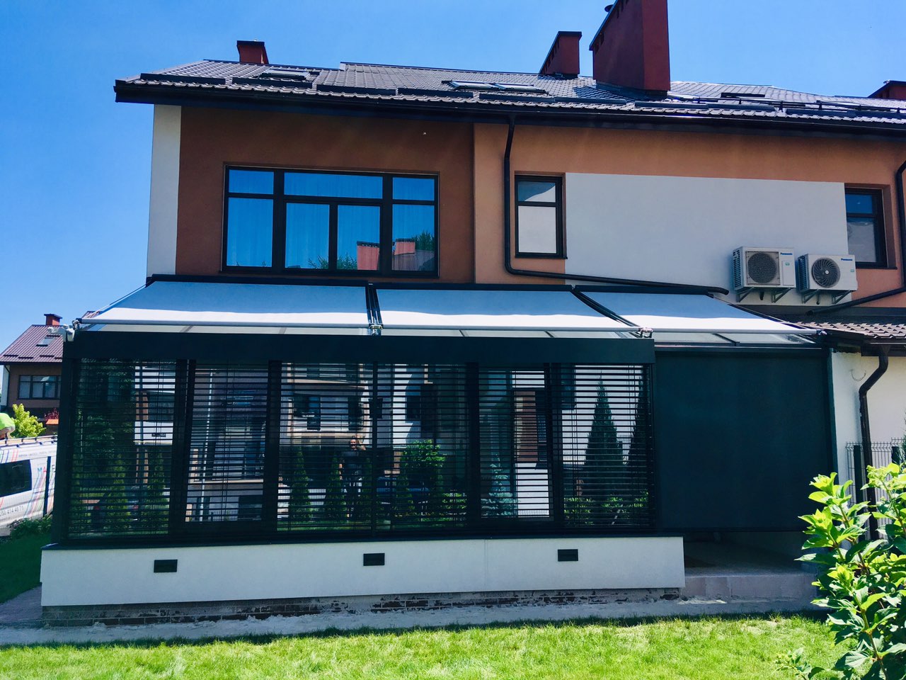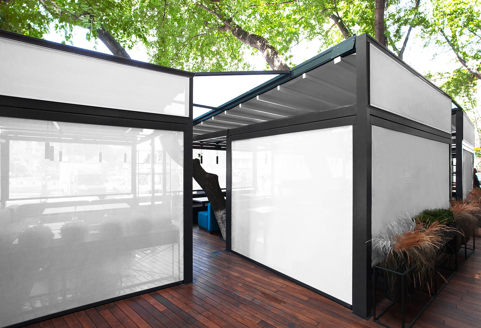 Вітростійка система з алюмінію та нержавіючої сталі для захисту простору від сонця, дощу та бокового вітру.
