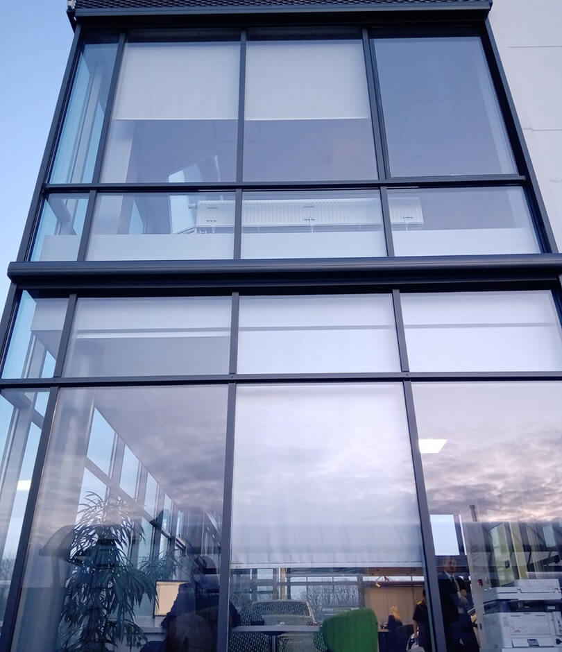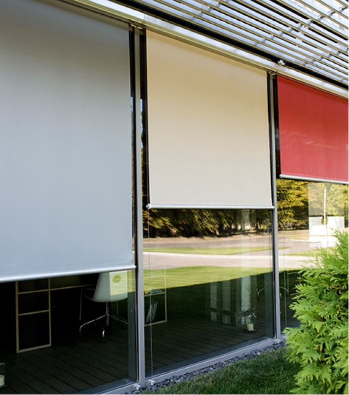 Великий асортимент як зовнішніх, так і внутрішніх систем, таких як жалюзі, рулонні штори, карнизи, текстиль.